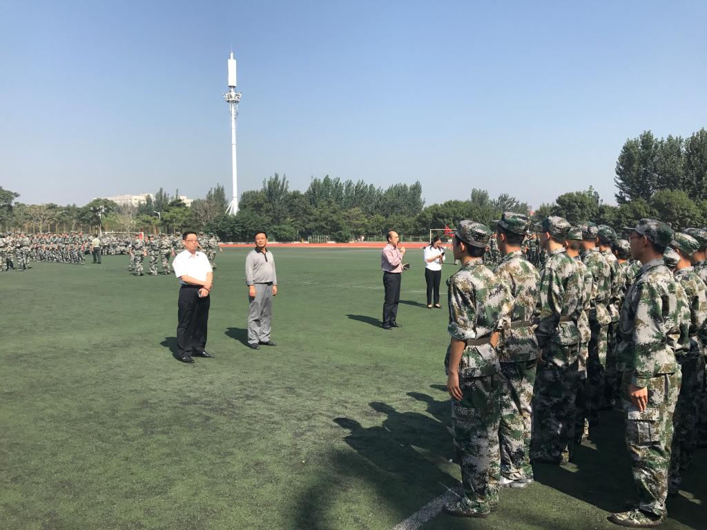 党委书记李社教,党委副书记党玉敬,副院长柯杨,党委办公室主任张亚歌,行政办公室主任杨卫红,团委负责人张大帅一行到军训现场慰问2017级新生。