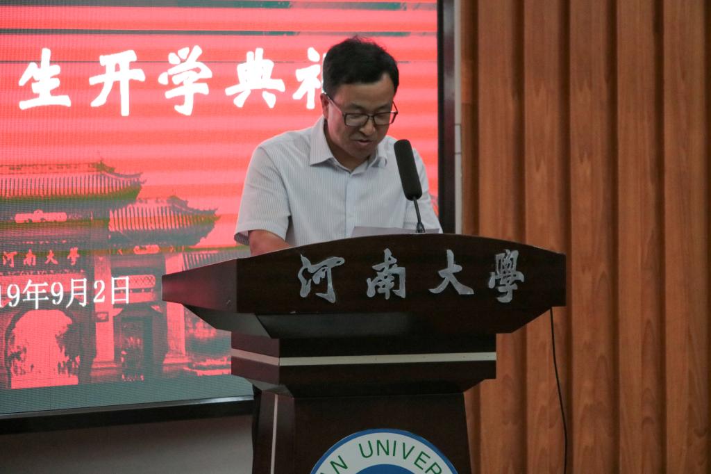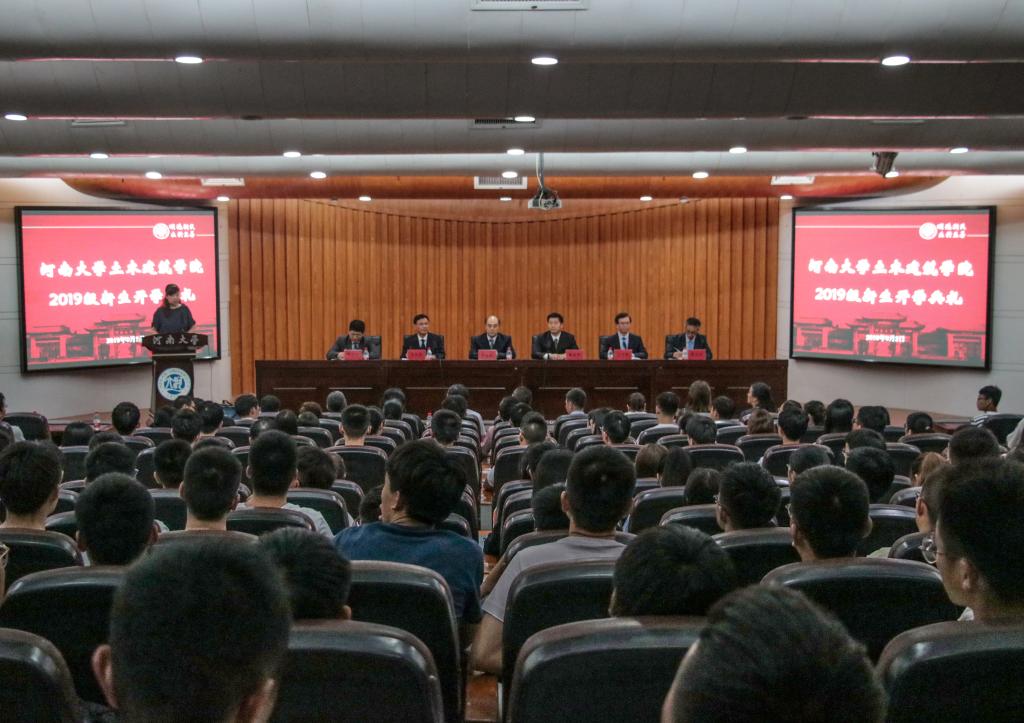 2019级新生开学典礼在行政楼二楼报告厅举行。学院党委书记李社教、院长岳建伟、党委副书记党玉敬、副院长张建伟、张大伟、郭保来等领导莅临现场,各系教师代表、学院相关部门负责人以及2019级全体本科生和研究生参加了此次典礼。典礼由党委副书记党玉敬主持。