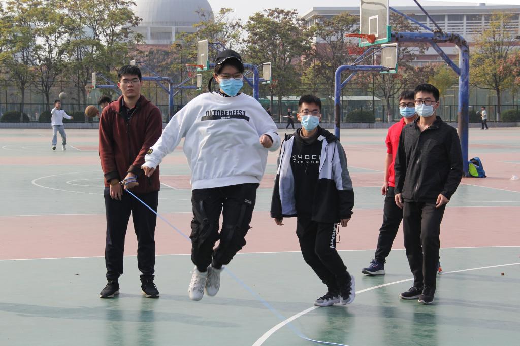年级长陈泓羽介绍了本次趣味运动会的流程以及相关规则,本次活动共设置六个环节,分别是五角一元、跳大绳、拔河、篮球投篮、四人五足接力赛、信任背摔。运动会以“五角一元”项目拉开序幕。