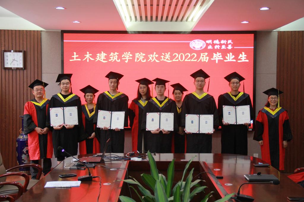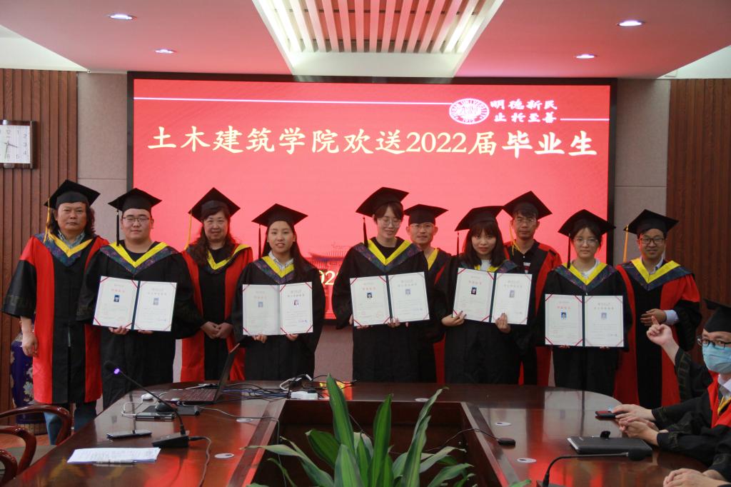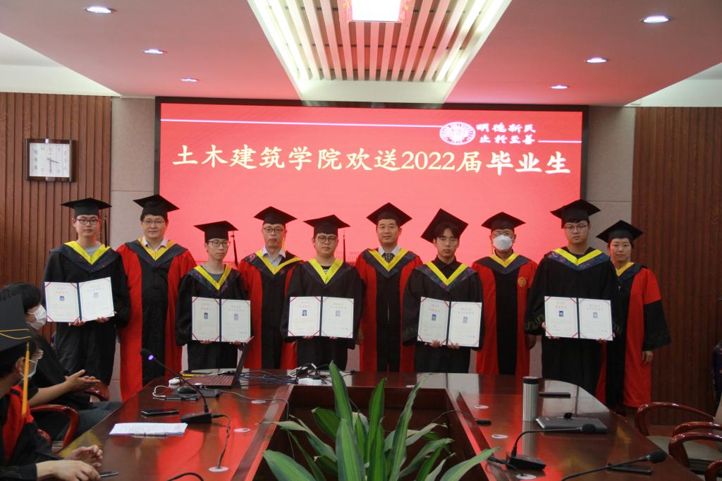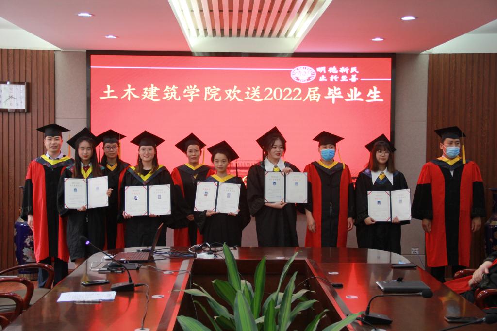 领导和在座教师为毕业生颁发了毕业证书和学位证书,并合影留念。