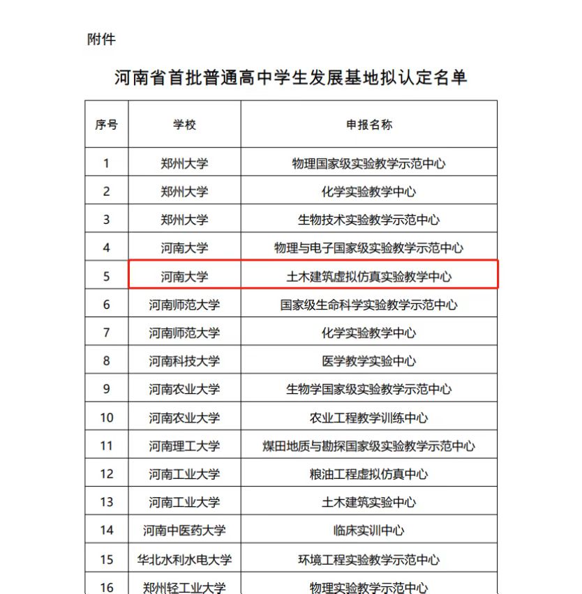 为深入推进普通高中新课程改革和高考综合改革,丰富普通高中学生发展实践场所,持续提升普通高中学科建设水平,加强学生学科素养培养,根据《河南省教育厅办公室关于遴选首批河南省普通高中学生发展实践基地的通知》(教办基〔2022〕112号)文件要求,经学校推荐、省级评审,学院土木建筑虚拟仿真实验教学中心被认定为首批河南省普通高中学生发展基地。