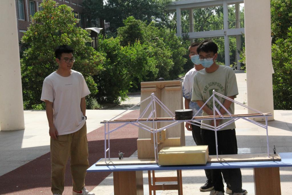 夏日炎炎,各参赛人员带着他们的参赛作品在学院楼前的圆形广场准备就位,各队伍按照抽取的顺序依次进行结构模型承载力测试及答辩,比赛开始首先进行模型结构测量,不满足参赛条件视为不合格。所有参赛作品统一进行称重记录。称重完成后,选手按照抽签次序上场,依照测试流程对模型进行一二三级逐级加载。加载过程扣人心弦,选手和观众们都屏气凝神,期待着模型能够加载成功。伴随着重物的承重、负重小车的通过、小钢球对模型的冲击,三轮加载正式结束,选手们悬着的心也缓缓落下。加载完毕后,评委老师根据各个环节的表现以及模型的结构打分,并针对模型的重量和结构做出评价,给出合理的优化方案。最终,第八组荣获一等奖;第一组、第五组荣获二等奖;第四组、第六组、第三组荣获三等奖。