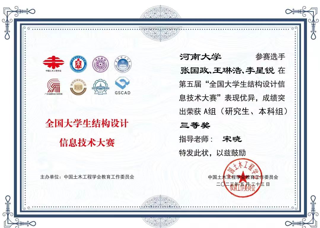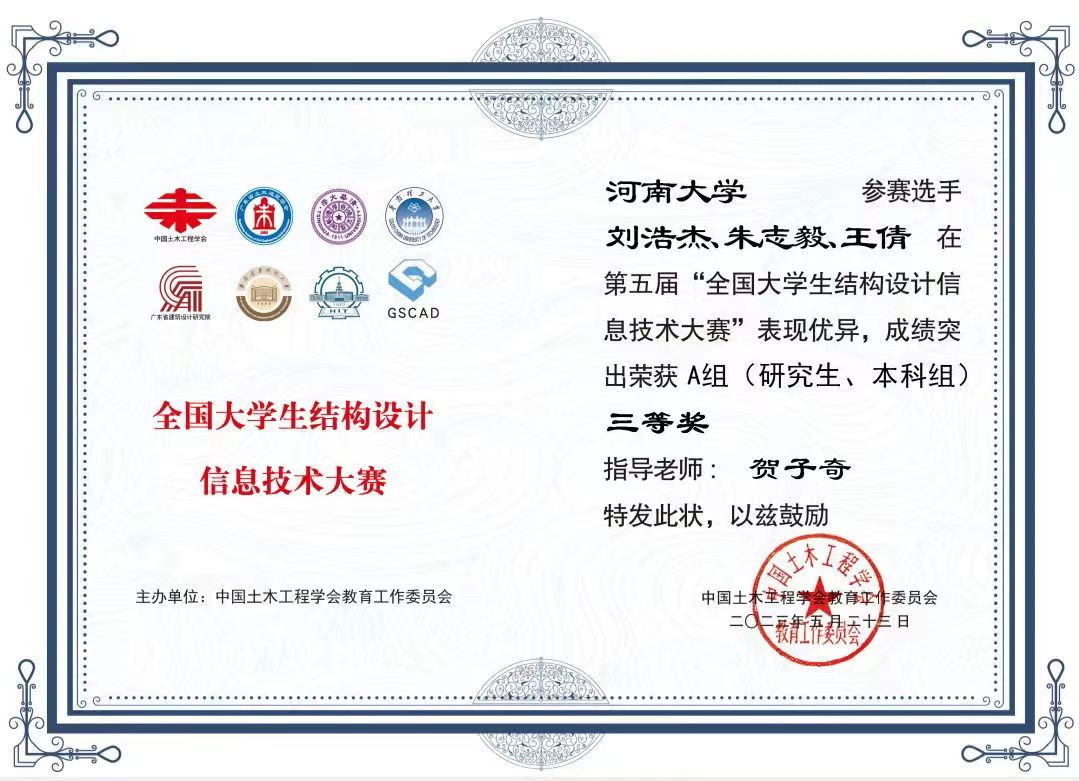 本届大赛由中国土木工程学会教育工作委员会和清华大学土木水利学院主办,共有来自全国328所院校的2266支队伍参与报名。比赛设计要求参赛选手具备扎实的专业基础知识、较强的结构优化设计及分析计算能力的同时,还要求选手对BIM相关技术前沿知识有一定的了解,以快速学习和使用相关软件进行结构设计。同时这也是一个锻炼大学生科技创新能力和实践技能的好机会。自本届大赛启动以来,学院广泛动员,加大支持力度,注重挖掘学校资源,通过举办专题报告、搭建经验交流平台、组织培训讲座等活动。指导老师和学生多次召开组会进行题目分析、内容研讨以及图纸建模等细节打磨。最终,贺子奇老师指导的刘依凡、伍恒、吴晗小组获得二等奖,贺子奇老师指导的刘浩杰、朱志毅、王倩小组,宋晓老师指导的张国政、王琳浩、李星锐小组获得三等奖。