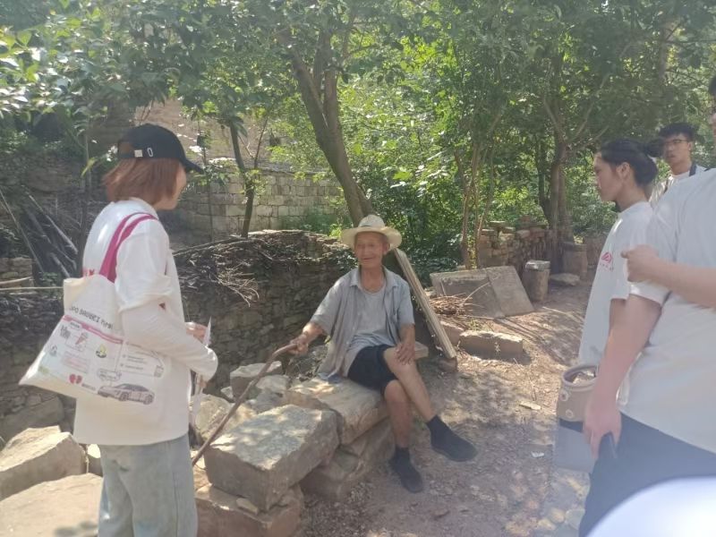 队员们首先来到八路军豫西抗日后方医院柏树崖遗址。遗址内房舍、窑洞、院落保存较为完好。由于山路纵横、交通不便,村民们就地取材,以石头为主要建筑材料,形成了独特的“石头村”风貌。大家在柏石崖村进行沿路探访,就村落文化、传统习俗、红色故事等方面与村民们进行了深入的交流与调研。同时,大家向村民们分发宣传页,普及习近平新时代中国特色社会主义思想,推动理论知识的普及与实践。