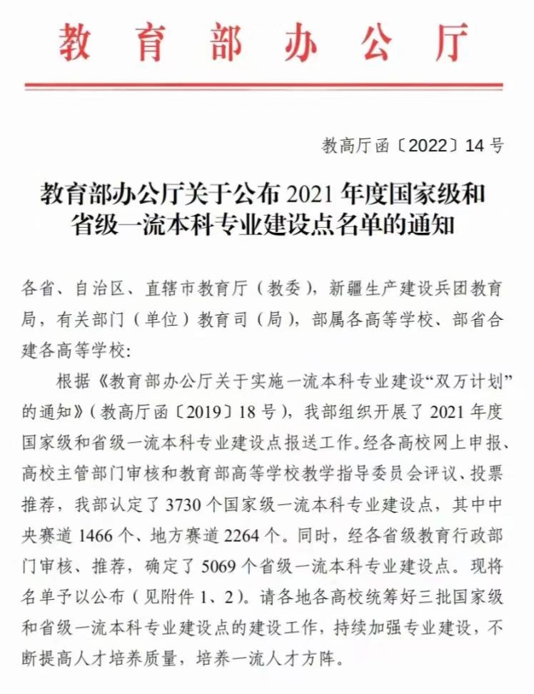近日,教育部办公厅发布《关于公布2021年度国家级和省级一流本科专业建设点名单的通知》(教高厅函[2022]14号),蘑菇视频