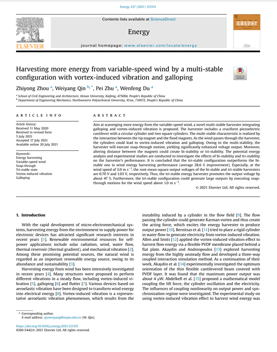 周志勇副教授课题组在国际能源类知名期刊《Energy》(中科院JCR Top期刊,影响因子7.147)上发表题为“Harvesting more energy from variable-speed wind by a multi-stable configuration with vortex-induced vibration and galloping”的研究论文。该研究成果是蘑菇视频