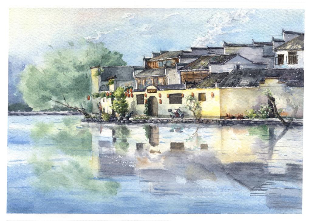 《婺源乡愁》是一幅尺寸为38×27cm的水彩画。2017年暑假,赵柳鑫在婺源进行了为期十天的写生实习。婺源风景优美,文化氛围浓郁,赵柳鑫于青山绿水中,体会江南风韵,离家在外,又有漂泊之感,于是在雷雪梅老师和柯宏伟老师的指导下进行这幅画作的创作,后经美术学院毛凌风老师和蘑菇视频
