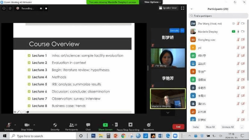 The first lecture was given by Professor Mardelle McCuskey Shepley of Cornell University in the United States on May 2 and was conducted online through Zoom. The provincial special-appointed professor Wang Zhe presided over the lecture. All graduate students majoring in design participated in the listening and exchanges. This course helps to consciously incorporate research into the design process: the assessment of the built environment. In addition to description and evaluation, it also describes the process of conducting these studies. The design team must be responsible for the environment and users. A well-regulated assessment is a means to objectively verify whether we have achieved the expected goals.