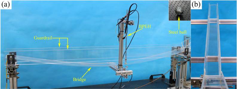 双稳态桥梁俘能结构模型:(a)桥梁结构 b)加速轨道