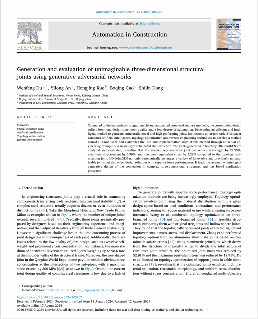 钢与空间结构研究所杜文风课题组在国际土木工程领域知名期刊《Automation In Construction》(中科院JCR一区top期刊,影响因子9.6)期刊上发表题为“Generation and Evaluation of Unimaginable Three-Dimensional Structural Joints Using Generative Adversarial Networks”的研究论文。该研究成果是蘑菇视频