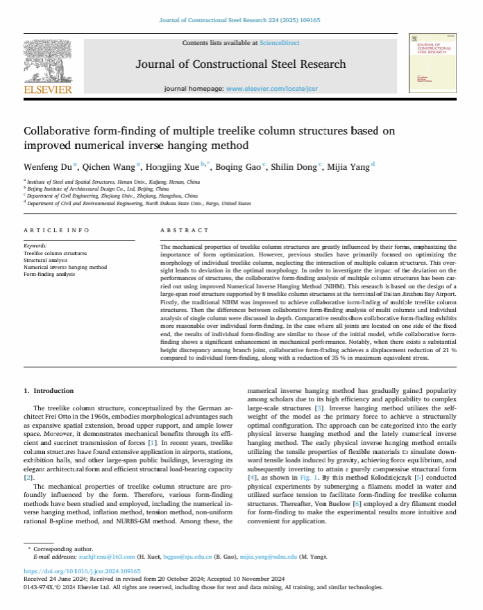 钢与空间结构研究所杜文风课题组在国际土木工程领域知名期刊《Journal of Constructional Steel Research》(中科院二区期刊,影响因子4.2)上发表题为“Collaborative form-finding of multiple treelike column structures based on improved numerical inverse hanging method”的研究论文。该研究成果是蘑菇视频