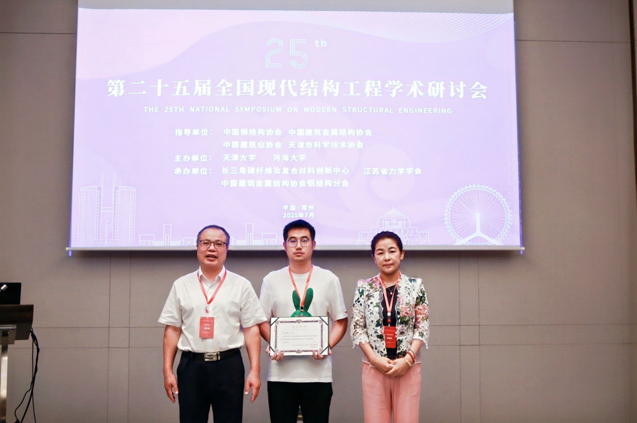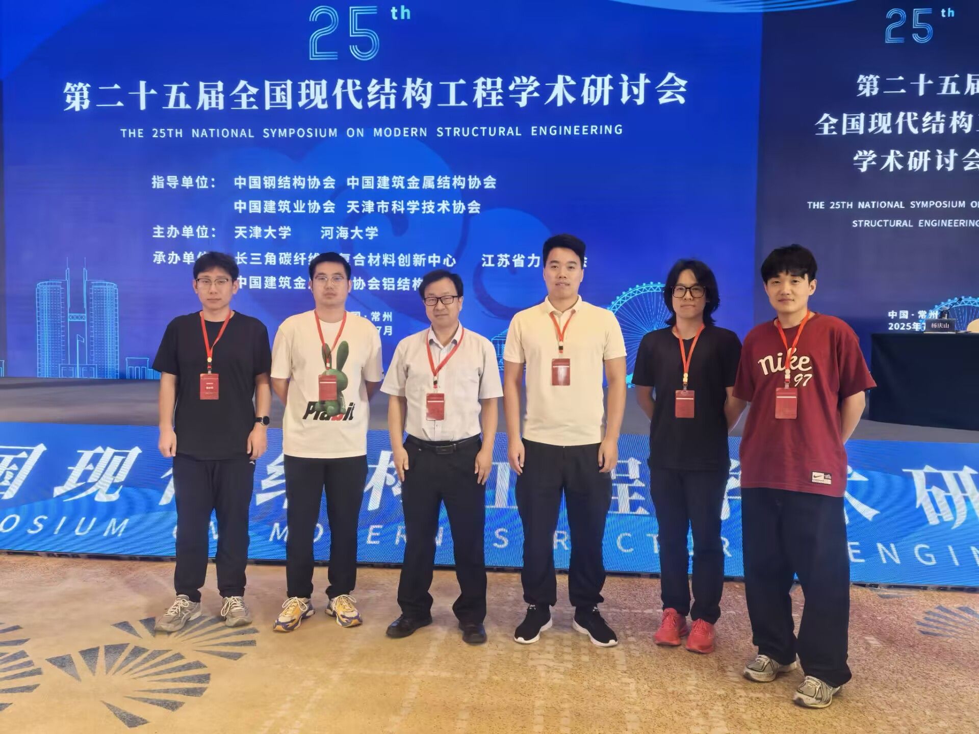 2025年7月19—20日,第二十五届全国现代结构工程学术研讨会在江苏常州隆重召开。本届大会以“开创性·前瞻性·高科技”为主题,吸引了来自全国高校、科研院所及龙头企业的350余位专家学者。我中心派出师生代表团共6人——研究生韩永超、王启晨、张恒、张庆民、赵远卓与导师杜文风教授——全程深度参与,成为会场内外受瞩目的团队之一。