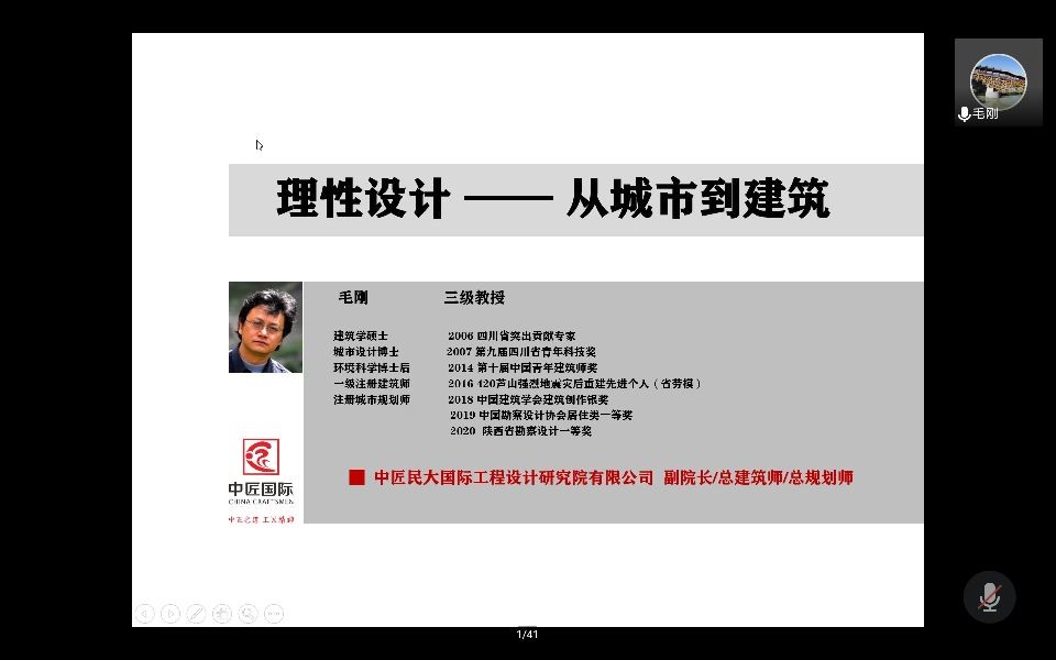 师生做题为“理性设计---从城市到建筑”的线上学术报告。毛刚教授作为我国世纪之交的首批城市设计学博士,长期深耕于西南地区的城市建设与建筑创作实践。先后历任绵阳市建委主任、四川省城乡规划设计研究院总工程师及420芦山地震灾后重建指挥部副指挥长总规划师,获中国建筑学会创作金奖及全国勘察设计一等奖等诸多行业奖项。现为中国城市规划学会生态规划委员会委员、中国建筑学会资深会员、中匠民大国际工程公司总建筑师。