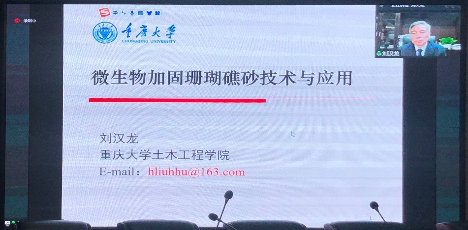 的关心与帮助表示感谢,并详细介绍了刘汉龙教授的个人基本情况。刘汉龙教授报告题目为《微生物加固珊瑚礁砂技术与应用》,从国家战略需求、关键技术、原理等方面详细阐述了微生物加固技术的研究进展及应用;重点介绍了微生物加固钙质砂静力特征、动力特征及现场试验,深入浅出的为蘑菇视频