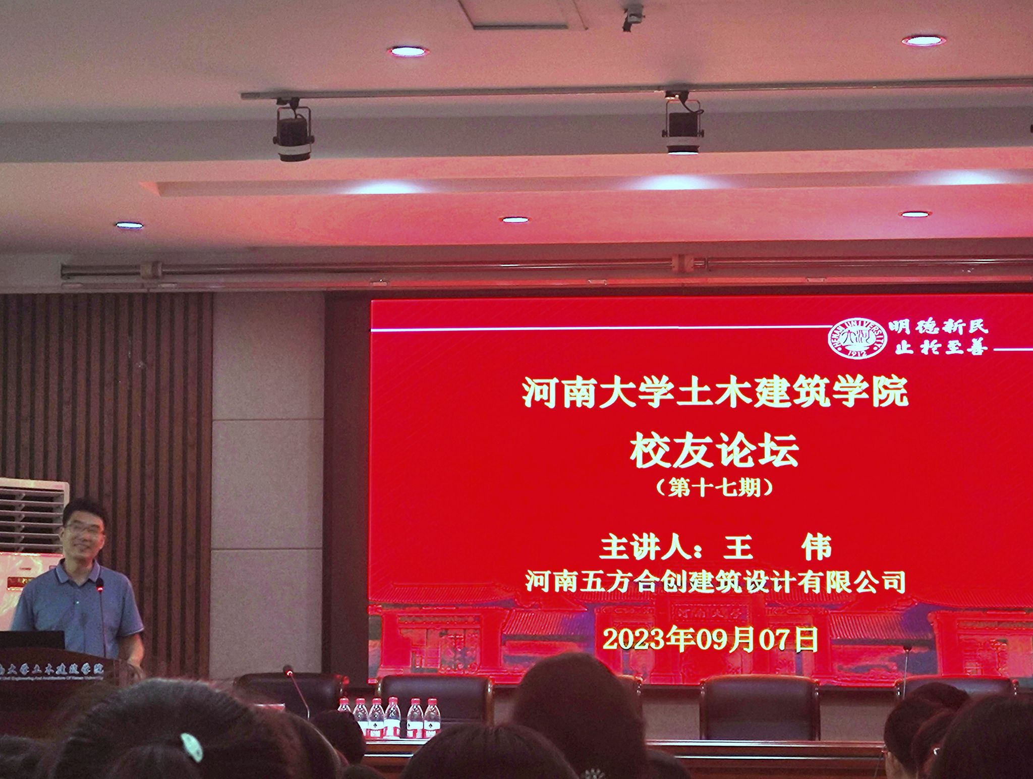 96届建筑学专业校友王伟受邀在结构报告厅为2023级新生进行了”建筑十二谈”的优秀校友职业生涯规划分享会”,王伟现任职河南第五方合创建筑设计有限公司总建筑师、副总经理。