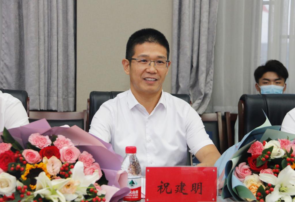 1994级校友、河南省第二建设集团有限公司总经理祝建明,学院2000级校友、公司副总经理燕中,公司总工程师苏群山、人力总监张浩敏,校友工作与教育发展基金会办公室主任刘波,蘑菇视频