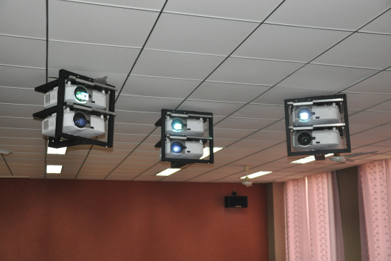 三通道环幕立体投影系统、配套图形设备系统、计算工作站以及立体头盔等高性能计算和虚拟仿真设备,如图1~图4。拥有开发和服务功能的虚拟仿真软件,如:Unity3D、Virtools、VRP、3DMax、ANSYS、ABAQUS、FLASH、Revit等仿真模拟软件。